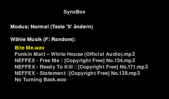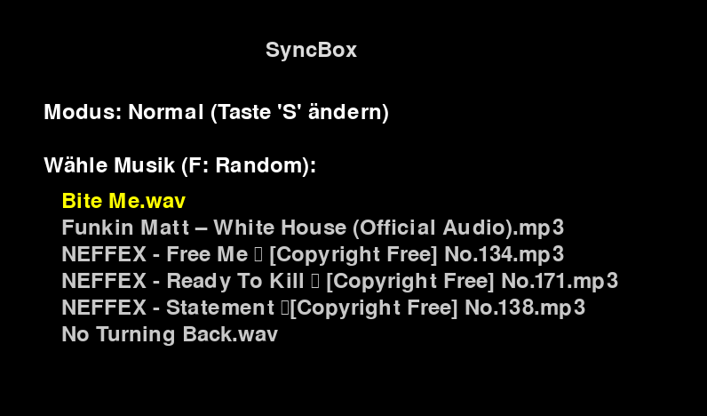 Run SyncBox.py Make sure your songs are in C:\Users\User\Music – or add your own tracks.